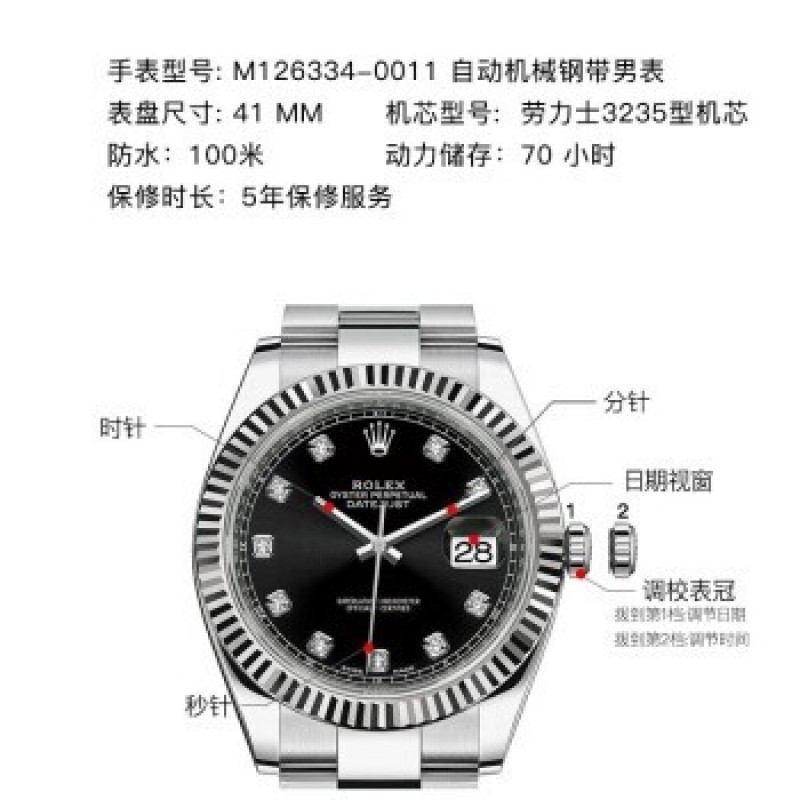 Swiss Rolex Watch Datejust 41 Series Automatic Mechanical Men's Watch M126334-0011 Black Disk With Diamond Three-Grid Chain R$82656.1 |